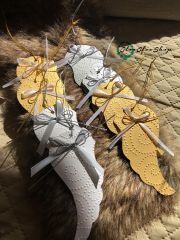 Ezüst szürke és fehér, gyöngyház fényű papírból kézzel vágtam ki angyalszárnyakat, melyeket domborítottam és szalagokkal díszítettem. Karácsonyfadísznek vagy ajándékkísérőnek ajánlom szeretettel. Egy tábla csokit vagy egy könyvet is nagyon szépen lehet vele díszíteni, a hátuljára akár egy rövid üzenet, pár kedves szó is írható. A szárnyak magassága kb. 11 cm, plusz az akasztó. Ez a csomag 2 darab fehér és 4 darab ezüst színű (összesen tehát 6 darab) díszt tartalmaz. Termékeim között más színösszeállítás is megtalálható!